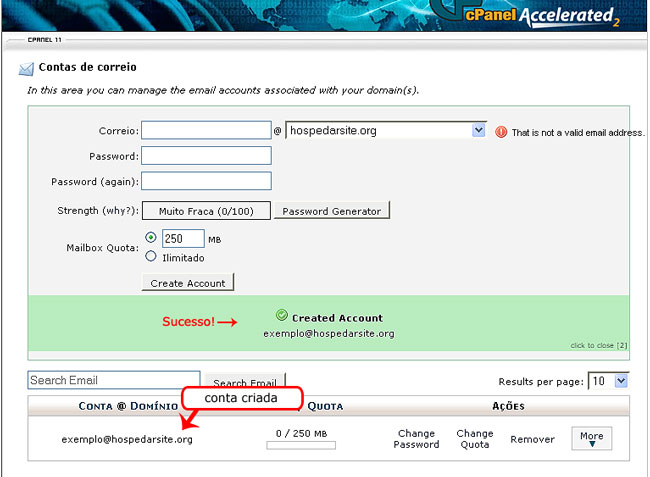 • Na página contas de correio, no primeiro formulário você digita um nome para seu e-mail , como “exemplo”; “contato”; “faleconosco”; “josé”; “maria”; “josé.silva”; etc. Como exemplo seu e-mail ficará Este endereço de email está sendo protegido de spambots. Você precisa do JavaScript ativado para vê-lo..